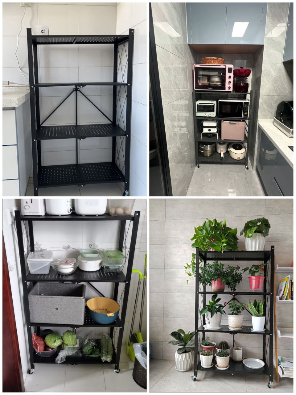وحدة الرفوف القابلة للطي سهلة التجميع، ما عليك سوى فكها وتركيبها، كما أنها مزودة بعجلات دوارة 360 درجة لتسهيل الحركة أو لتثبيتها.